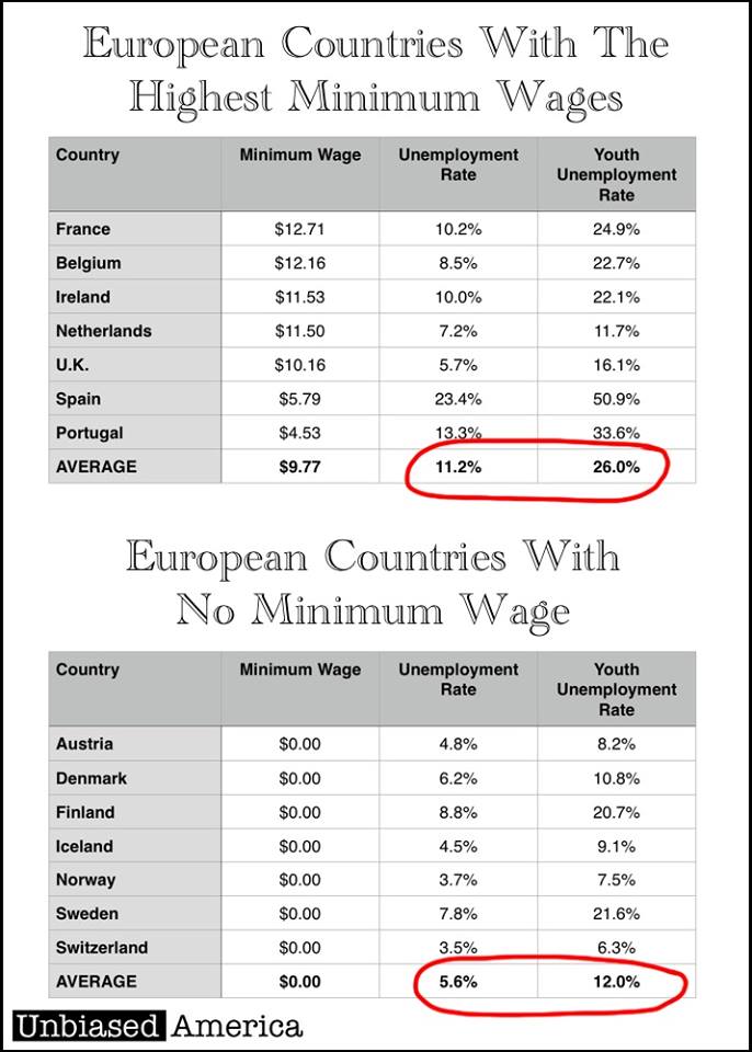 Courtesy of Mark Perry comes this table contrasting the unemployment rates in European countries with statutory minimum wages versus those without such constraints. Just further evidence that the true goal of minimum wage advocates is not jobs, but to prevent wage competition from younger, less skilled workers. As the song goes, "Nice work . . . if you can get it."